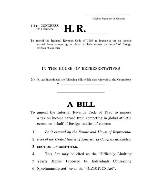 这场风波的导火索,源于美国田纳西州共和党众议员安迪·奥格尔斯在米兰冬奥会期间抛出的一项极端法案。据悉,奥格尔斯提出了一项名为“奥林匹克法案”的立法动议,拟对美国公民或绿卡持有者中那些代表中国、俄罗斯、伊朗、朝鲜等国参加国际赛事的运动员征收高达100%的惩罚性重税。该法案全称为“正式限制个人因体育精神而获得的年度资金法案”,其征税范围不仅包括赛事奖金,更涵盖了运动员在代表上述国家参赛期间所获得的全部赞助收入及其他商业报酬。